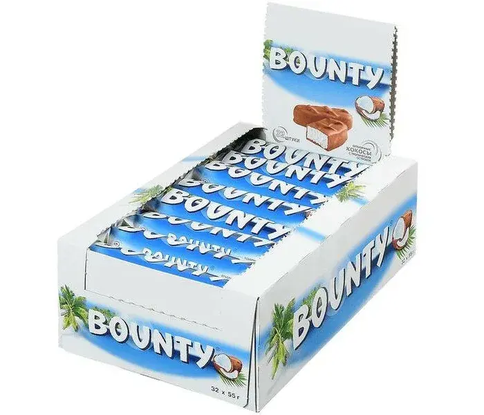 Bounty - нежный шоколадный батончик с тропическим вкусом, сочетающий мягкую кокосовую начинку и молочный шоколад. В упаковке - два батончика по 27,5 г, что позволяет регулировать порцию и дольше сохранять свежесть.