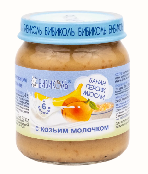 Фруктово‑зерновое пюре «БИБИКОЛЬ» «Банан, персик с мюсли и козьим молочком» (100 г) — специализированный продукт детского питания для малышей