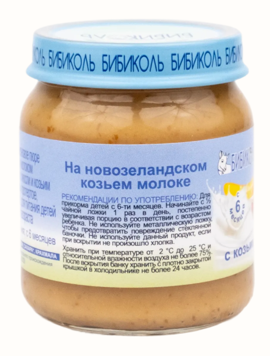 с 6 месяцев. Изготовлено на основе натуральных фруктовых пюре, обогащено сухим козьим молоком и мягкими мюсли. Имеет протёртую, однородную консистенцию