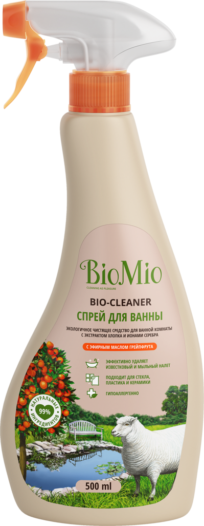 Экологичное чистящее средство для ванной комнаты BIO-BATHROOM CLEANER с эфирным маслом грейпфрута эффективно и бережно удаляет грязь, известковый и мыльный налет в ванных комнатах и душевых кабинах, придавая блеск раковине, ванне, керамической плитке и хромированным изделиям. Не повреждает поверхность. Специальная формула с ионами серебра обеспечивает антибактериальную защиту, экстракт хлопка оказывает мягкое действие на кожу рук, а эфирное масло грейпфрута поднимает настроение и дарит чувство бодрости. Преимущества. Отлично подходит для использования в домах с автономной канализацией. Не содержит: хлор, фосфаты, агрессивные ПАВ, SLES, ПЭГ, синтетические отдушки и красители. Безопасно для планеты. Имеет экологический сертификат "Листок жизни". BioMio - линейка эффективных средств для дома, использование которых приносит удовольствие. Продукты, созданные с любовью и заботой, идеально справятся с загрязнениями, оставаясь при этом абсолютно безопасными, экологичными и особенно незаменимыми, если в доме есть малыш. Способ применения. Поверните носик распылителя до символа "ON". Нанесите средство на очищаемую поверхность (для сильных загрязнений оставьте на несколько минут), протрите поверхность губкой или щеткой и смойте водой. По окончании применения поверните носик распылителя в положение "OFF".