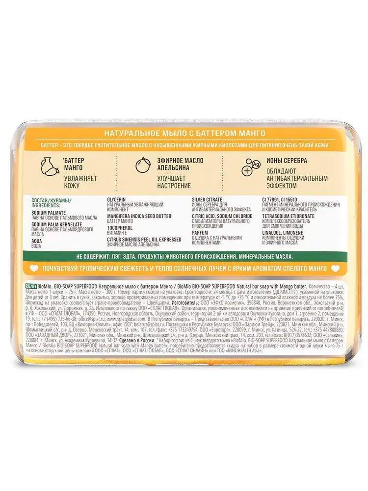 Состав: Натриевые соли жирных кислот пальмового масла, натриевые соли жирных кислот пальмоядрового масла, вода, глицерин, масло манго, токоферол, эфирное масло апельсина, цитрат серебра, лимонная кислота, хлорид натрия, отдушка с натуральными компонентами, пигмент минерального происхождения (CI 77891), косметический краситель (CI 15510), тетранатрия этидронат, линалоол (компонент натурального эфирного масла и отдушки), лимонен (компонент натурального эфирного масла и отдушки).