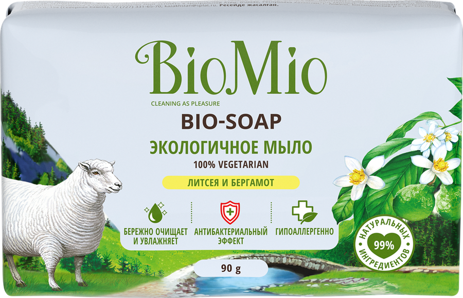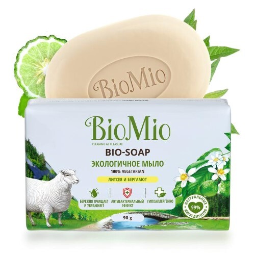 Экологичное туалетное мыло BIO-SOAP с эфирными маслами литсея кубебы и бергамота - 100% вегетарианское - в его составе не содержатся компоненты животного происхождения. Мыло BioMio гипоаллергенно, благодаря чему отлично подходит для людей с чувствительной кожей. Специальная формула мыла с оливковым маслом и витамином Е обеспечивает бережный уход за кожей, ионы серебра обладают антибактериальным эффектом, а композиция из эфирных масел литсея кубебы и бергамота бодрит и стимулирует творческое мышление. Не содержит: ПЭГ, красители, синтетические ароматизаторы, ЭДТА, продукты животного происхождения. BioMio - линейка эффективных средств для дома, использование которых приносит удовольствие. Продукты, созданные с любовью и заботой, идеально справятся с загрязнениями, оставаясь при этом абсолютно безопасными, экологичными и особенно незаменимыми, если в доме есть малыш.