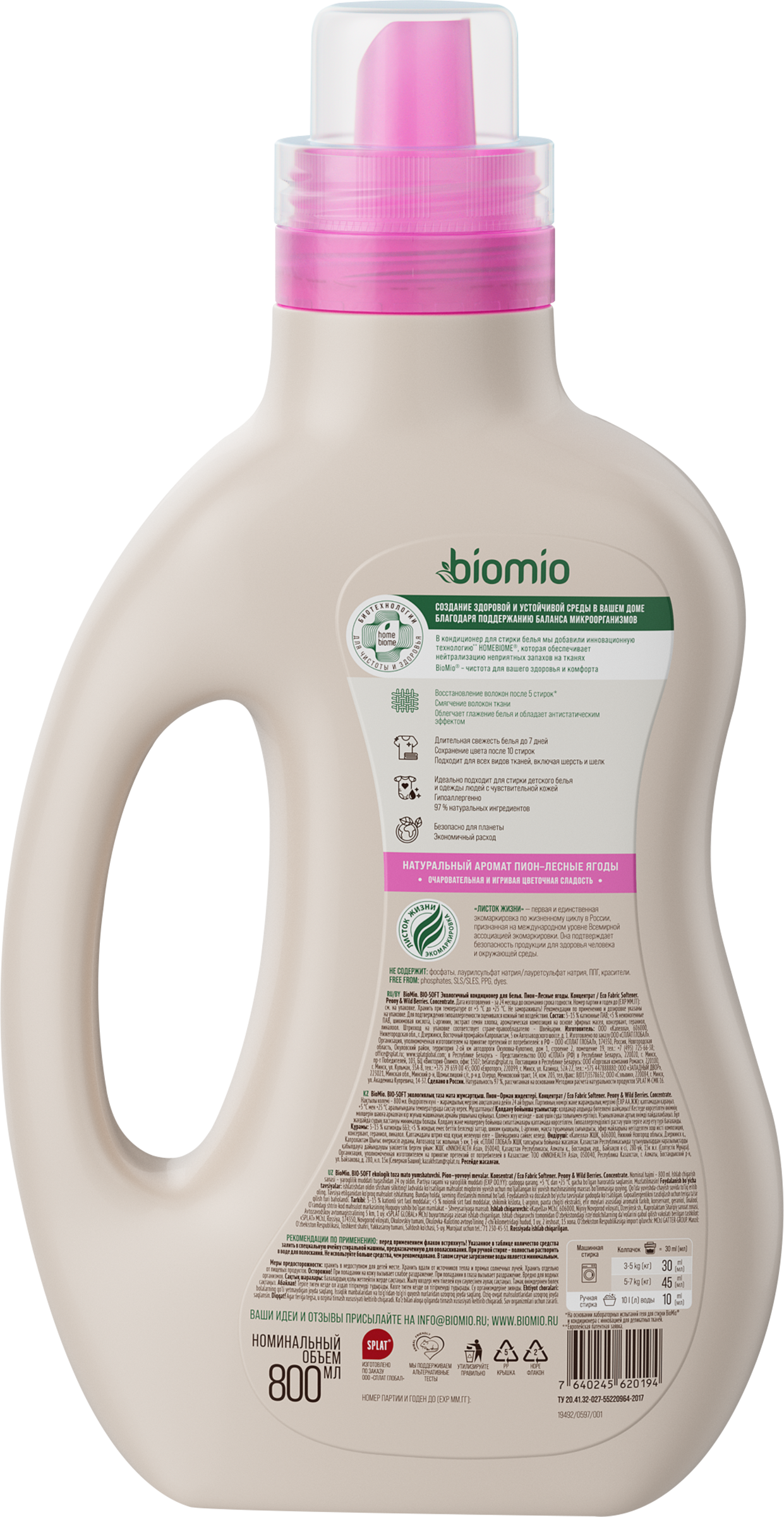 Кондиционер BioMio с ароматом «Пион‑Лесные ягоды» - биоразлагаемое средство для смягчения белья и придания ему нежного, стойкого аромата. Подходит для всех типов тканей, включая деликатные.