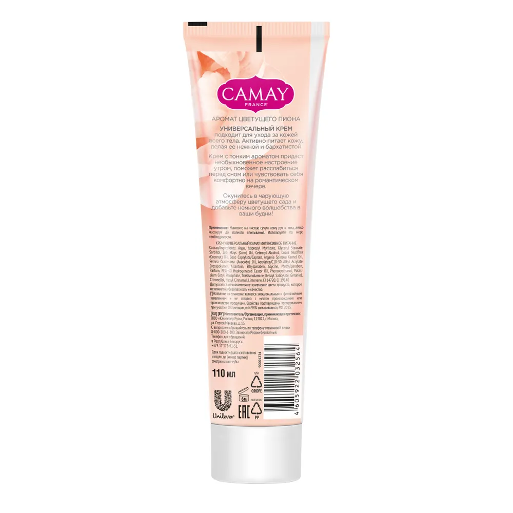 Универсальный крем CAMAY с маслами арганы и кокоса обеспечивает интенсивное питание и длительное увлажнение кожи. Лёгкая текстура быстро впитывается, не оставляя жирного блеска и ощущения липкости. Нежный цветочный аромат (ноты пиона) создаёт приятное послевкусие ухода. Подходит для всех типов кожи и может использоваться на любых участках тела. Компактный формат 110 мл удобен для пробного знакомства с продуктом или для ношения в сумочке.