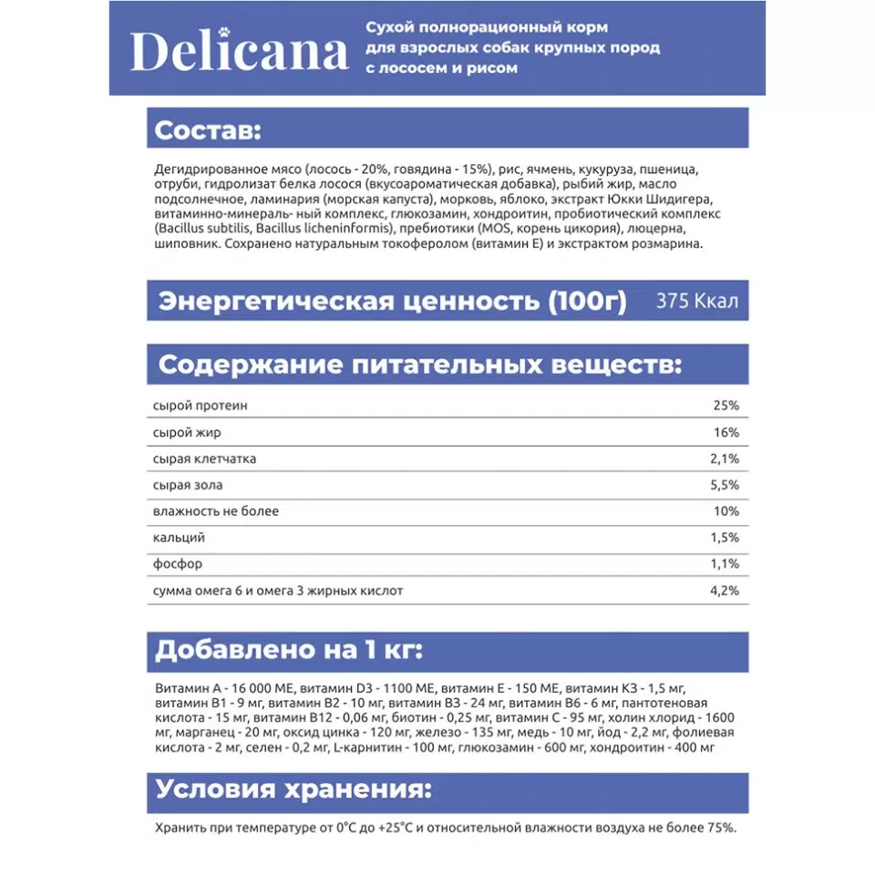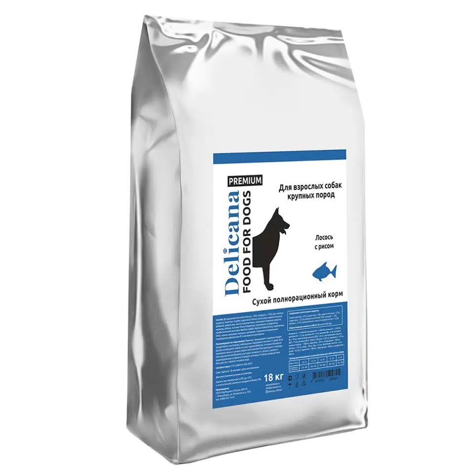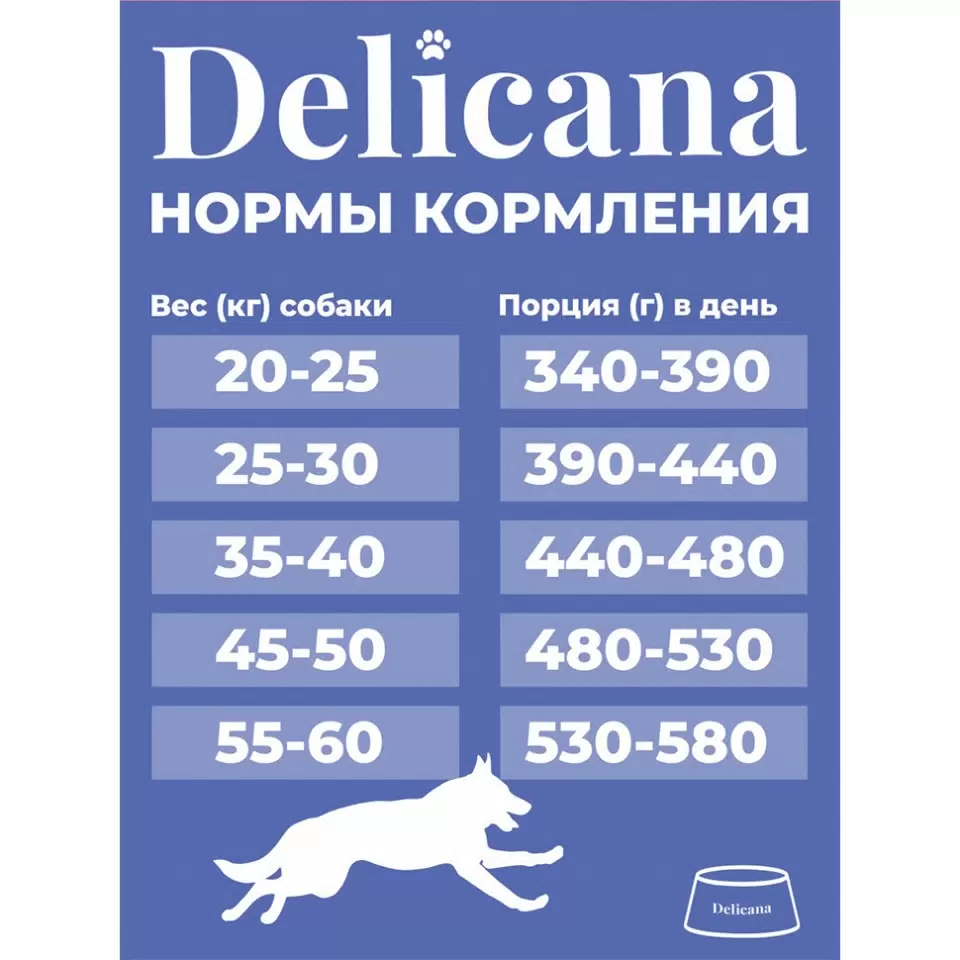 Полнорационный сухой корм премиум‑класса DELICANA для взрослых собак крупных пород (весом от 25 кг) от 1 года.