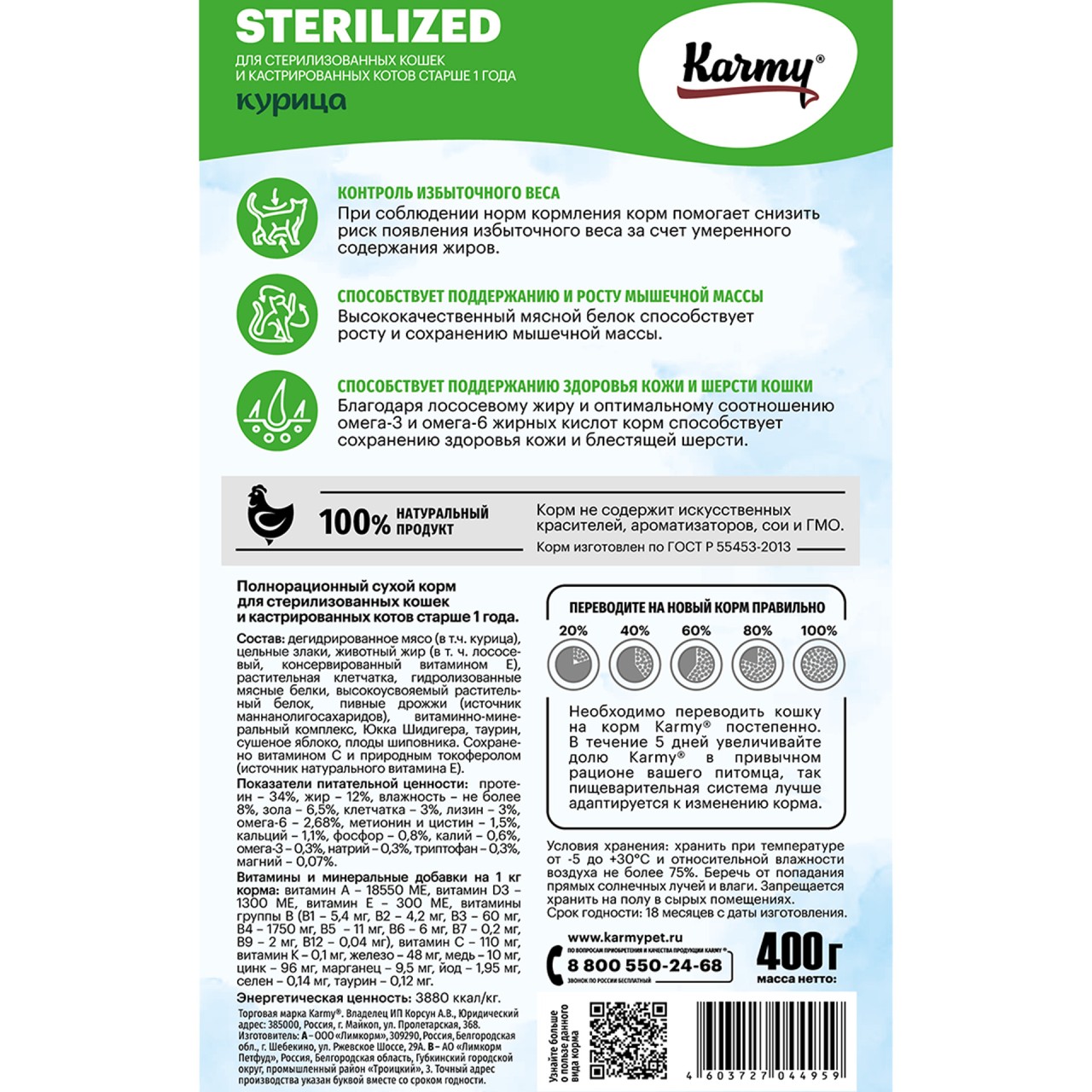 KARMY Sterilized с курицей — полнорационный сухой корм премиум‑класса для стерилизованных взрослых кошек и кастрированных котов старше 1 года. Формула разработана с учётом особых потребностей питомцев после стерилизации: помогает поддерживать оптимальный вес, здоровье мочевыводящей системы и иммунитет. Нежный вкус курицы привлечёт даже привередливых животных. Упаковка весом 400 г удобна для пробного кормления или дополнения основного рациона.