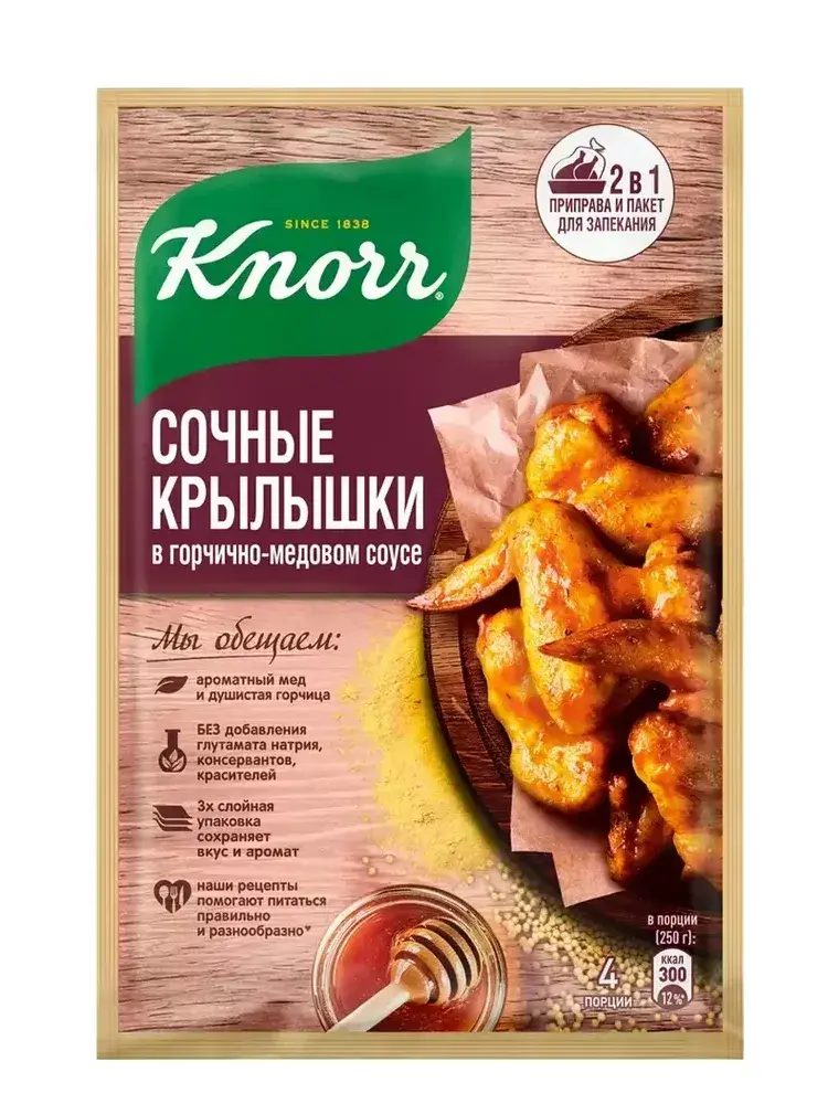 Кнорр "На второе Куриные крылышки в горчично-медовом соусе" - это идеальная смесь специй и сухого соуса, которая помогает быстро приготовить крылышки с аппетитной сладко-пряной глазурью. Горчично-медовый соус создаёт золотистую карамельную корочку, подчёркивая естественную сочность мяса, а тщательно подобранные специи обеспечивают сбалансированный аромат без лишней остроты. Просто смешайте содержимое пакета с водой или маслом, обваляйте крылышки и запекайте - результат будет ярким, ароматным и по-домашнему вкусным.
