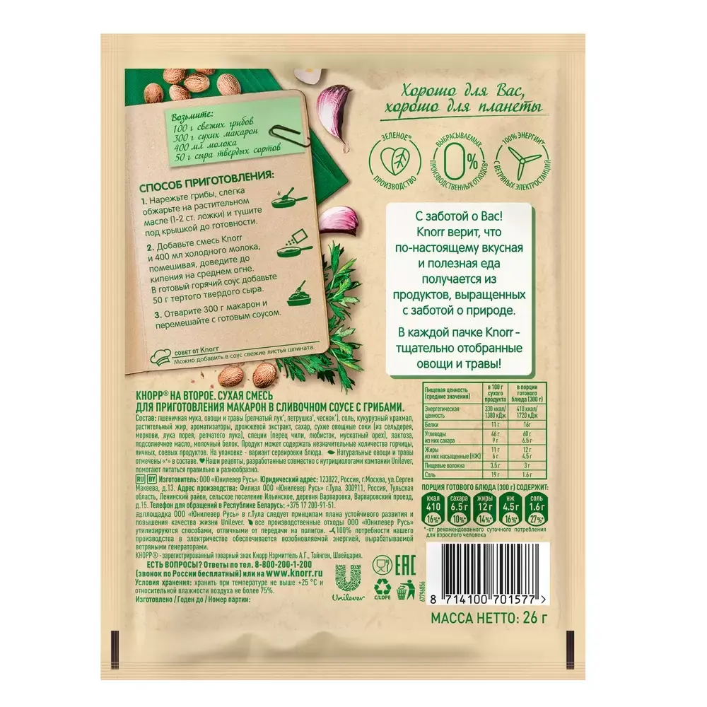 Кнорр "На второе Макароны в сливочном соусе с грибами" - это удобная и вкусная основа для приготовления ароматного блюда в итальянском стиле за считанные минуты. Нежный сливочный соус, в сочетании с ароматом шампиньонов и тщательно отобранными специями, придаёт макаронам мягкий вкус, насыщенную текстуру и аппетитный запах.