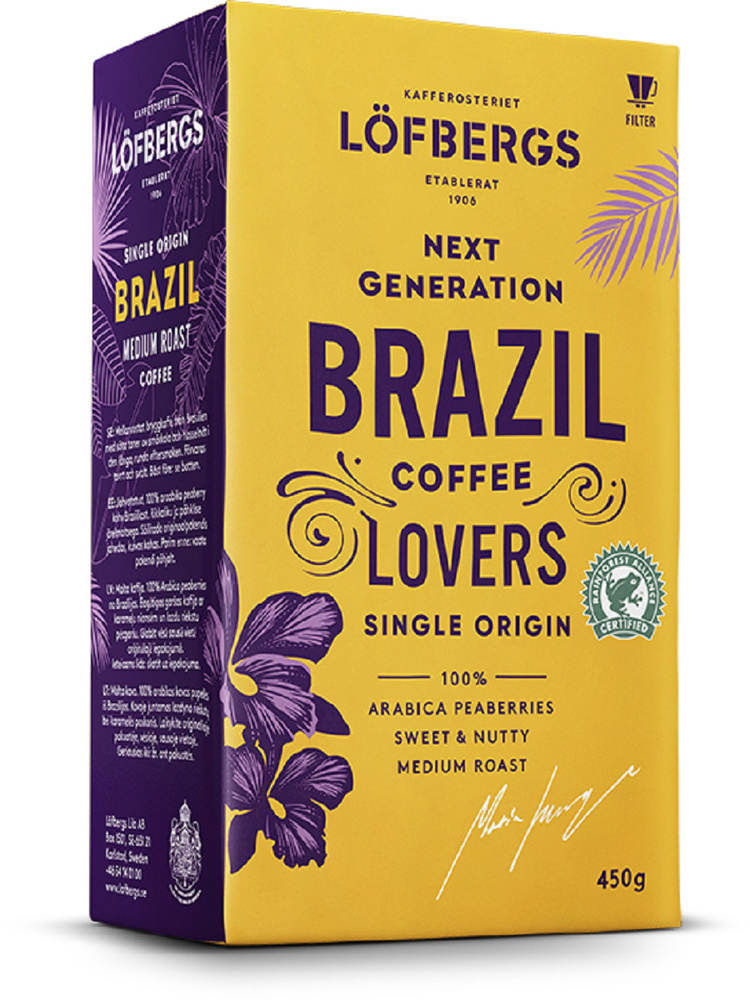 Löfbergs Brazil Single Origin — молотый кофе высшего сорта из растущих на родине арабики в Бразилии (Peaberries), обладающий сладкими и ореховыми нотами с мягким, круглым послевкусием. Смесь 100% арабики, обжарка средней степени (Medium Roast) подчёркивает карамельные и молочно‑шоколадные оттенки. Формат 450 г — оптимален для дома или офиса, если хочется премиального вкуса без лишнего объёма.