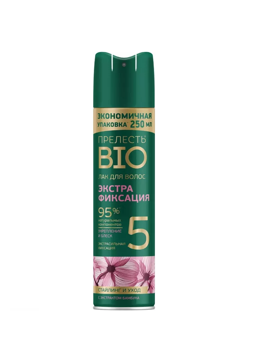 Лак экстрасильной фиксации (степень 5) из серии «Прелесть Био» надёжно сохраняет укладку до 24 часов.