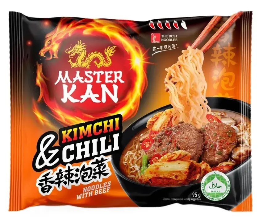 Лапша быстрого приготовления Master Kan со вкусом Kimchi Chili (95 г, упаковка‑пакет) — острый вариант для быстрого и сытного перекуса. Отличается насыщенным вкусом кимчи и пикантной ноткой перца чили. Готовится за несколько минут: достаточно залить кипятком и дать настояться. Подходит для обеда на работе, поездок и ситуаций, когда нужно быстро утолить голод. Яркая острота и аутентичные азиатские ноты делают этот продукт привлекательным для любителей острых блюд.