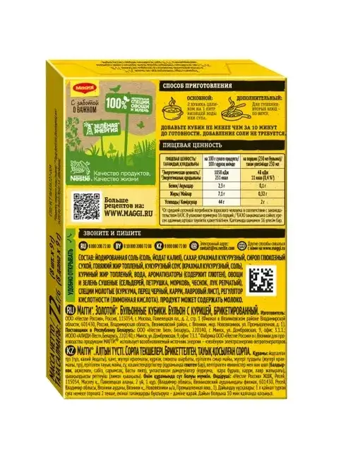 Maggi "Куриный Золотой" - это концентрированный куриный бульон в удобном формате, который помогает мгновенно добавить блюдам насыщенный, яркий и ароматный вкус. Одного кубика хватает, чтобы придать супам, кашам, соусам, подливам, овощным и мясным блюдам аппетитную куриную нотку и улучшить общий вкус без долгого варения бульона. Легко растворяется, экономит время и обеспечивает стабильный результат каждый раз.