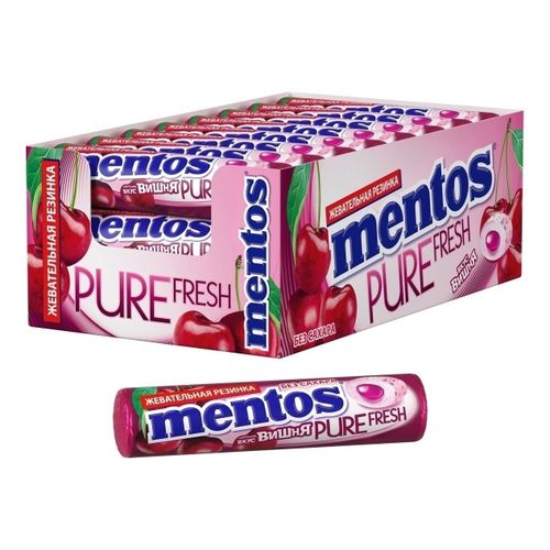 Жевательные конфеты Mentos со вкусом вишни — это яркие, сочные конфеты с насыщенным ягодным ароматом и нежной текстурой.