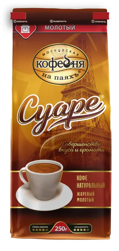 Кофе молотый «Суаре» - это натуральный молотый кофе с мягким, сбалансированным вкусом и деликатным ароматом.