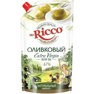 Майонез Mr. Ricco «Оливковый» Extra Virgin 67 % (375 г, дой‑пак) — насыщенный сливочный майонез на основе рафинированного подсолнечного и нерафинированного оливкового масла Extra Virgin. Обладает богатым вкусом с характерными нотками оливкового масла и лёгкой пикантностью. Имеет густую, однородную кремовую текстуру. Идеален для заправки салатов, приготовления соусов, сэндвичей, горячих блюд и закусок. Удобная упаковка дой‑пак обеспечивает лёгкое дозирование, компактное хранение и возможность брать продукт с собой.