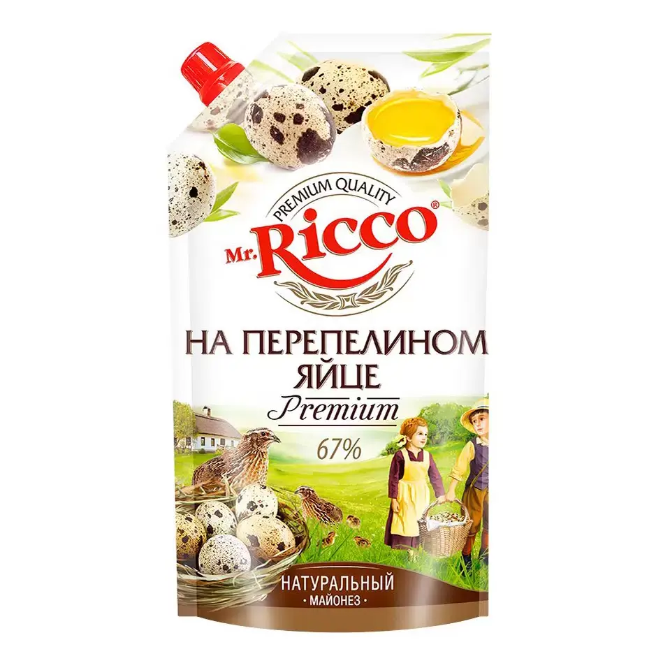 Mr. Ricco «Перепелиное яйцо» 67 % (750 г, дой‑пак) — насыщенный сливочный майонез на основе рафинированного подсолнечного масла с добавлением перепел ных яиц. Отличается нежным, богатым вкусом и бархатистой текстурой. Перепелиные яйца придают продукту особую питательную ценность и деликатный аромат. Идеален для заправки салатов, приготовления соусов, сэндвичей, горячих блюд и закусок. Удобная упаковка дой‑пак обеспечивает лёгкое дозирование, компактное хранение и удобство использования как дома, так и на выездных мероприятиях.
