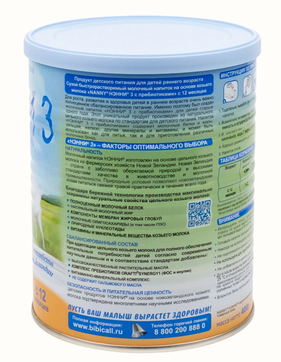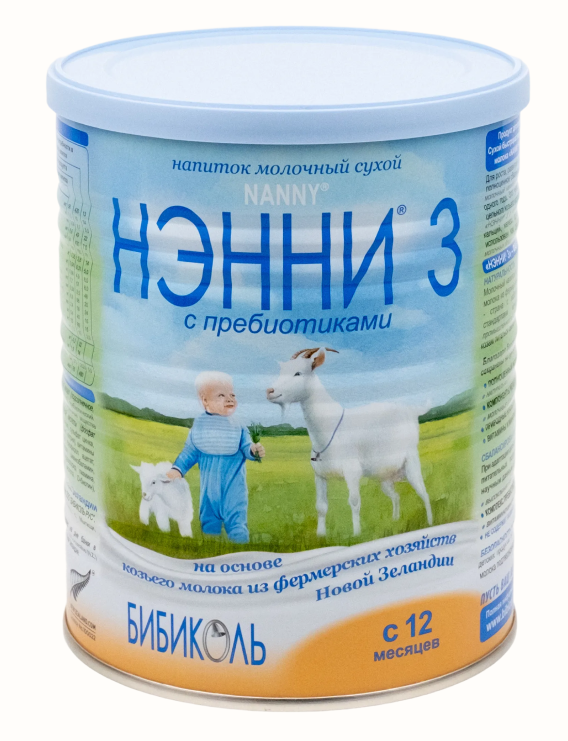 Сухой молочный напиток «НЭННИ 3» на основе козьего молока (400 г) — специализированное питание для детей от 1 года. Изготовлен из сухого цельного