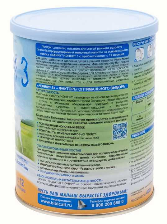 НЭННИ 3 – Сухая молочная смесь на основе козьего молока для детей старше одного года. Подходит для детей с непереносимостью белков коровьего молока и риском развития пищевой аллергии. Функциональное питание, отвечающее потребностям растущего детского организма. Содержит все необходимые витамины и микроэлементы, для нормального физического и умственного развития ребенка.