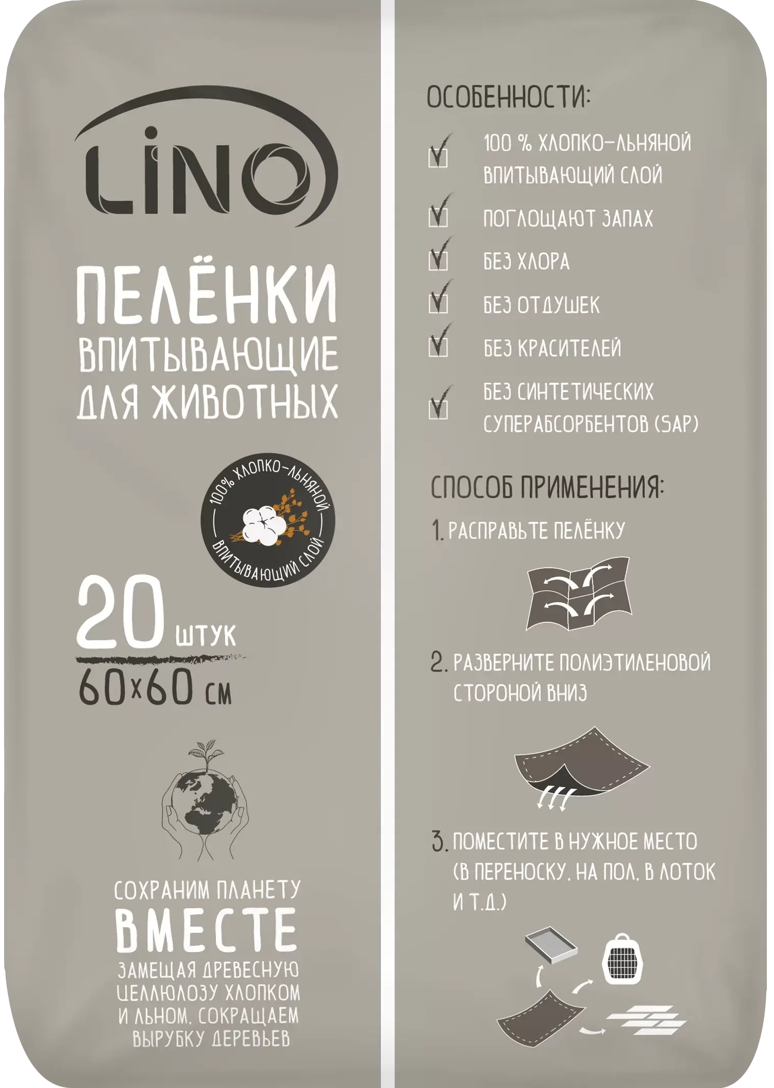 Одноразовые пелёнки LINO для домашних животных изготовлены из натурального хлопко‑льняного материала. Размер каждой пелёнки — 60 × 60 см, в упаковке 20 штук. Предназначены для гигиенического ухода за питомцами: подходят для приучения к лотку, защиты мебели и пола от загрязнений, использования во время путешествий, визитов к ветеринару, а также в период болезни или реабилитации после операций. Конструкция включает три слоя: верхний — воздухопроницаемое нетканое полотно, средний — впитывающий хлопко‑льняной слой, нижний — влагонепроницаемая плёнка, предотвращающая протекание. Пелёнки не содержат хлора, отдушек, красителей и синтетических суперабсорбентов.