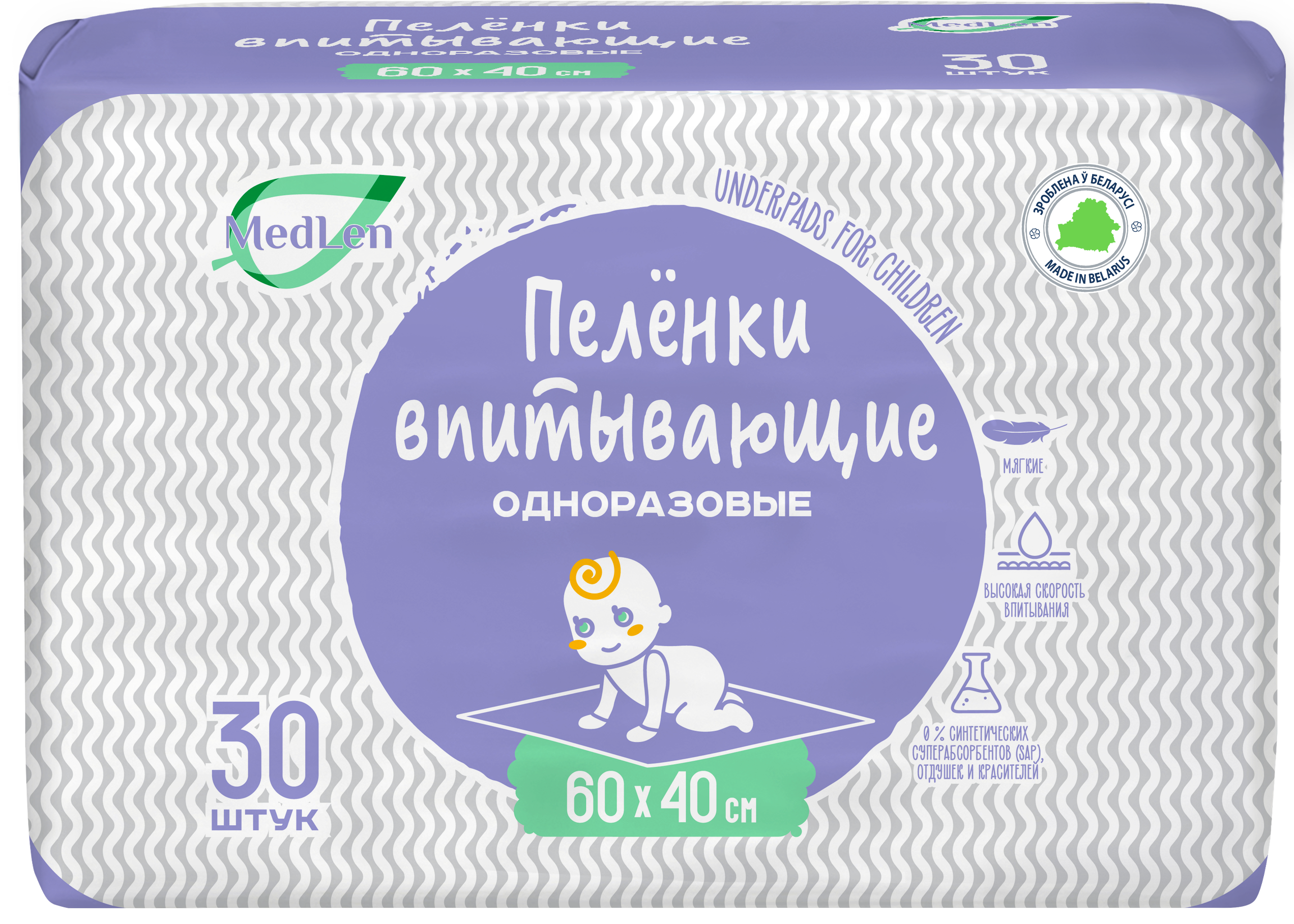 30 шт. в упаковке, размер 60 × 40 см (оптимален для большинства ситуаций), целлюлозный впитывающий слой, трёхслойная структура, мгновенное впитывание жидкости, равномерное распределение влаги внутри изделия, влагонепроницаемый нижний слой (защита от протекания), воздухопроницаемый верхний слой (предотвращает «парниковый эффект»), антискользящие свойства (не смещаются на поверхности), гипоаллергенность, отсутствие хлора, отдушек и красителей, защита от опрелостей и раздражений кожи, универсальность применения (кровать, пеленальный столик, коляска, автокресло, медицинские осмотры), простота утилизации (не требуют стирки), сохраняют форму при намокании (не комкаются), экологичный состав.