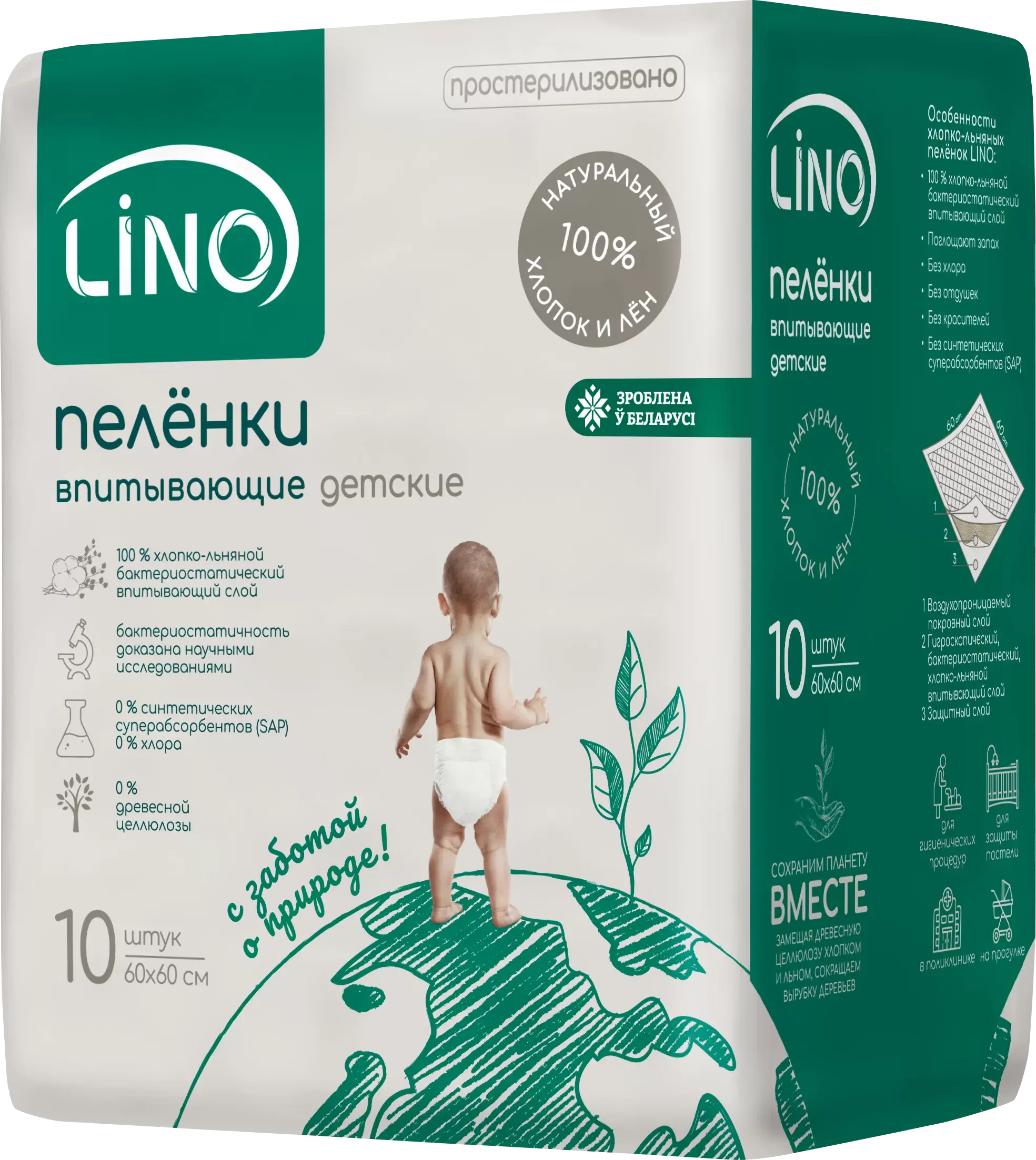 Впитывающие одноразовые пелёнки LINO для детей (размер 60 × 60 см, 10 шт. в упаковке) изготовлены с использованием хлопко‑льняного впитывающего слоя. Предназначены для гигиенического ухода: защищают постель и поверхности от влаги, удобны при смене подгузников, пеленании и проведении гигиенических процедур. Трёхслойная конструкция гарантирует комфорт и надёжность: верхний слой — мягкое воздухопроницаемое нетканое полотно, средний — впитывающий хлопко‑льняной слой (отбелён кислородным методом, без хлора), нижний — влагонепроницаемая плёнка, предотвращающая протекание. Пелёнки стерильны, гипоаллергенны, не содержат отдушек, красителей и синтетических суперабсорбентов, безопасны для чувствительной детской кожи.