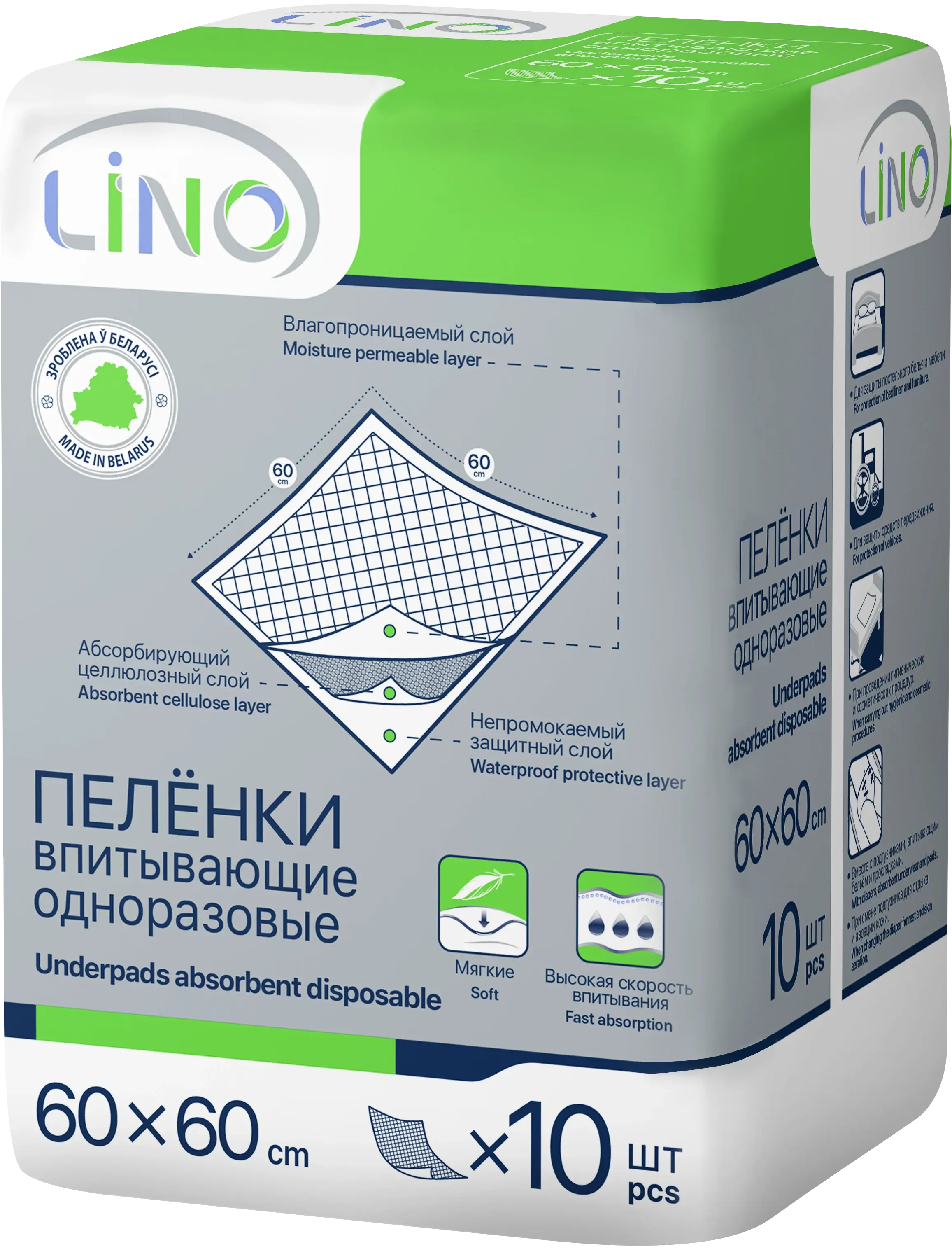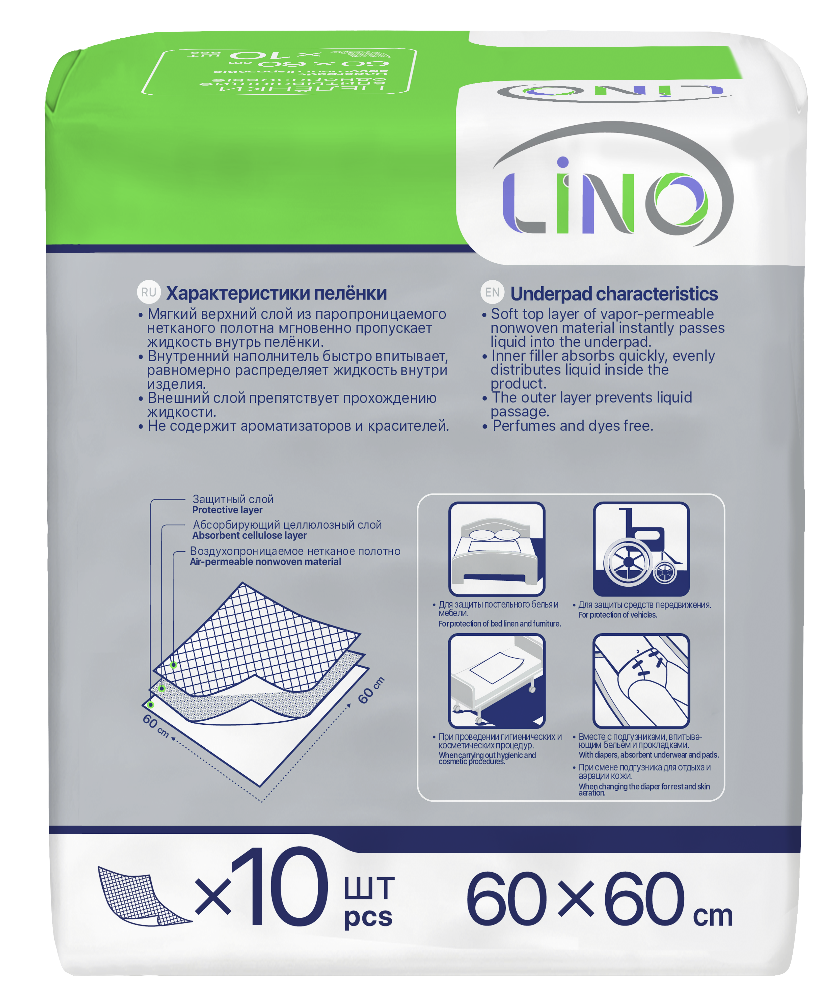 Впитывающие одноразовые пелёнки LINO с целлюлозным впитывающим слоем размер 60х60. Влагопроницаемый слой из нетканого полотна мгновенно пропускает жидкость внутрь пелёнки и сохраняет сухость. Впитывающий целлюлозный слой быстро и равномерно распределяет жидкость внутри пелёнки. Непромокаемый защитный слой препятствует выходу жидкости из пелёнки. Без отдушек, красителей и синтетических супер абсорбентов Рекомендуются к применению: -при уходе за людьми с ограниченными возможностями, лежачими больными, в том числе с недержанием, в домашних условиях; -для дополнительной защиты постельного белья и других поверхностей в домашних условиях от промокания при проведении гигиенических, диагностических, медицинских и др. процедур; -как подстилочный материал в поликлиниках и больницах для исключения контакта кожных покровов пациента с медицинским оборудованием и мебелью при проведении медицинских обследований и процедур; Пеленки LINO подходят для малышей, Их можно взять в поликлинику, на прогулку, в гости или в поездку. Пеленки - это надежное средство для любого возраста и разных ситуаций: для лежачих и больных людей, для младенцев или для домашних питомцев, собак или кошек.