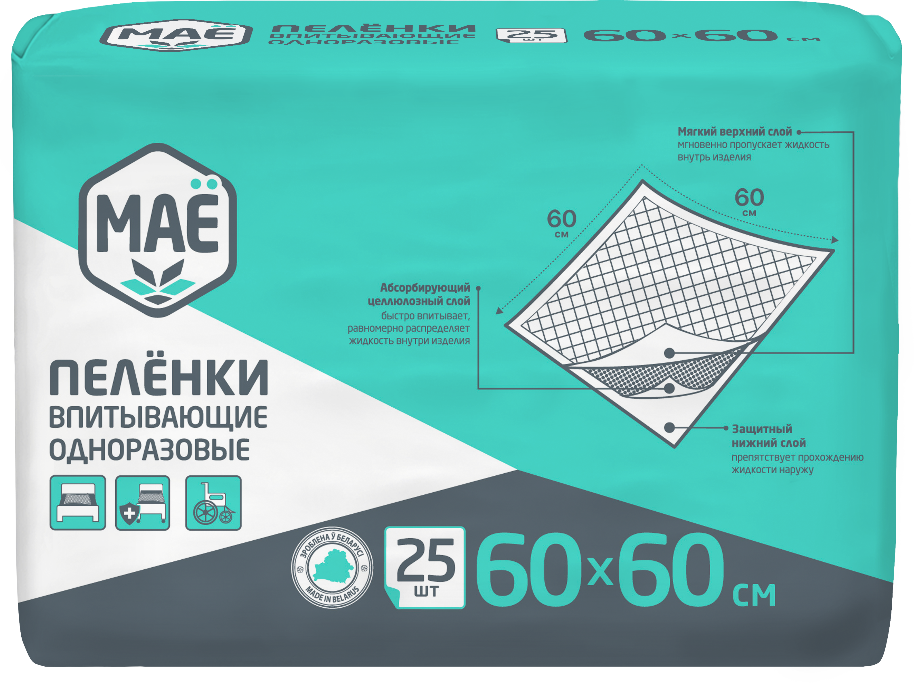 Впитывающие одноразовые пелёнки МАЁ (размер 60 × 60 см, 25 шт. в упаковке) — гигиеническое средство для защиты поверхностей и ухода за людьми и животными. Подходят для использования в домашних условиях, медицинских учреждениях и при транспортировке. Трёхслойная конструкция обеспечивает надёжную защиту от протеканий: верхний слой — мягкое нетканое полотно, средний — впитывающий целлюлозный слой, нижний — влагонепроницаемая плёнка. Пелёнки не содержат ароматизаторов, красителей и синтетических суперабсорбентов, гипоаллергенны и безопасны для чувствительной кожи.