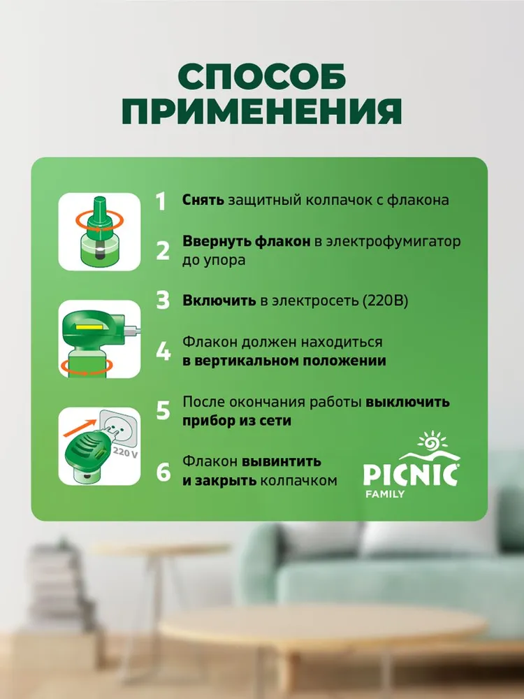 Подходит для использования в жилых комнатах, дачах, гостиницах. Один флакон рассчитан на 45 ночей при работе по 8 часов за ночь.