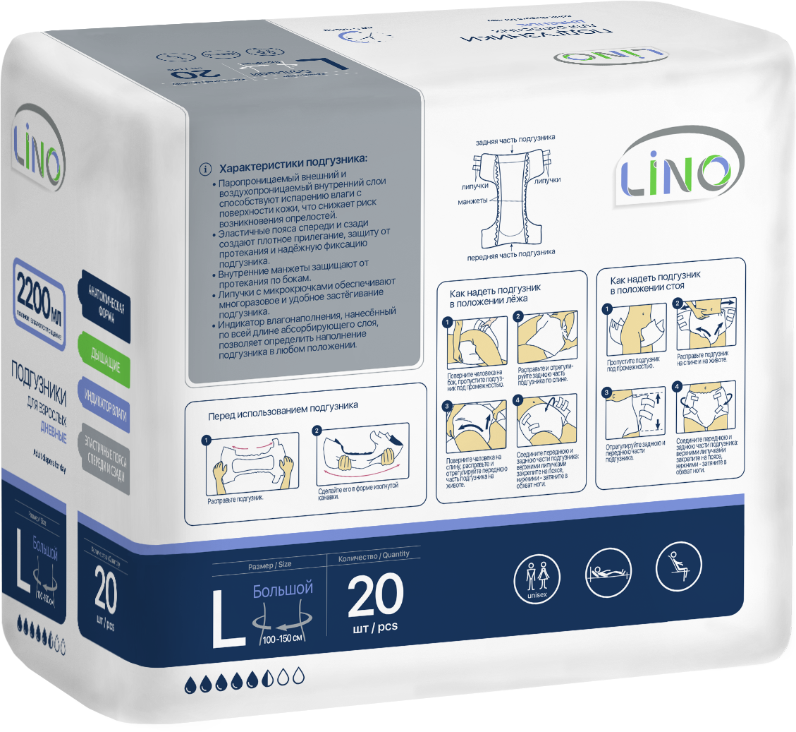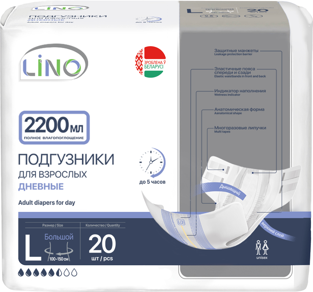 Подгузники для взрослых LINO дневные рекомендуются для людей лежачих, с ограниченными возможностями или ведущих активный образ жизни, со средней или тяжелой степенью недержания. Время использования подгузника до 5 часов. Максимальная защита от протекания во время активного движения. С улучшенными свойствами фиксации подгузника, охвата талии и ног. Большая анатомическая форма абсорбирующего слоя широко облегает тело, хорошо улавливает жидкость в лежачем положении, в том числе при лежании на боку. Памперсы для взрослых LINO гарантируют долговременное ощущение сухости и защиту от возникновения опрелостей.