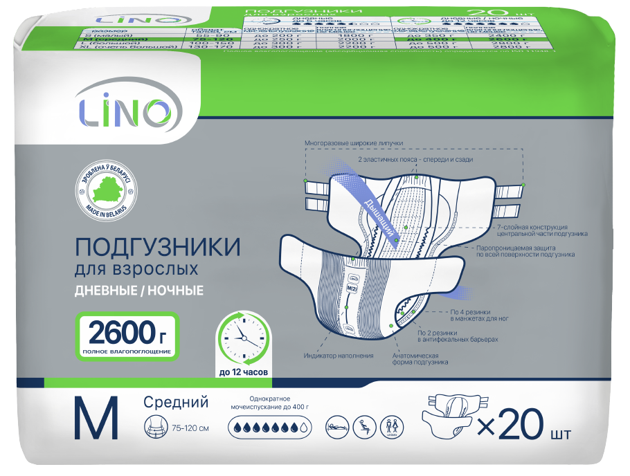Подгузники для взрослых LINO Дневные/Ночные с повышенной впитываемостью, рекомендуются для людей лежачих, с ограниченными возможностями или ведущих активный образ жизни; со средней или тяжелой степенью недержания. Время использования подгузника до 12 часов. Максимальная защита от протекания во время активного движения и в положении лёжа, в том числе на боку. С улучшенными свойствами фиксации подгузника, охвата талии и ног. Гарантируют долговременное ощущение сухости и защиту от возникновения опрелостей. подгузники предназначены для лиц со средней и тяжелой степенью недержания мочи и кала; высокая впитываемость и анатомическая форма подгузника обеспечивают надежную защиту в случае длительного использования днем и ночью, в том числе на боку; паропроницаемый внешний защитный слой – дублированный нетканый материал (плотностью не менее 26 г/м2), распределённый по всей площади подгузника гарантирует защиту от протекания, воздухообмену и испарению влаги, что снижает риск возникновения опрелостей; впитывающий слой состоит из распушенной целлюлозы и суперабсорбента (SAP), быстро поглощает и удерживает влагу, превращая ее в гель, создавая сухость внутри подгузника; специальная трехслойная конструкция впитывающего слоя (тампона) препятствует выходу суперабсорбента (SAP) наружу и контакту с кожей, что исключает вероятность возникновения раздражения и аллергии; широкие эластичные пояса на талии, cпереди и сзади (каждый в сжатом виде длиной не менее 12 см) создают плотное прилегание, защиту от протекания и устойчивую фиксацию подгузника на талии, препятствуют сползанию подгузника при движениях и ходьбе; застежки-липучки с микрокрючками (шириной 3 см) можно многократно крепить на подгузнике высокие антифекальные барьеры с эластичными резинками (по 2 штуки в каждом барьере) обеспечивают максимальную защиту от протекания по бокам подгузника; индикатор влагонаполнения, нанесенный по всей длине абсорбирующего слоя, позволяет определить наполнение подгузника в любом положении.