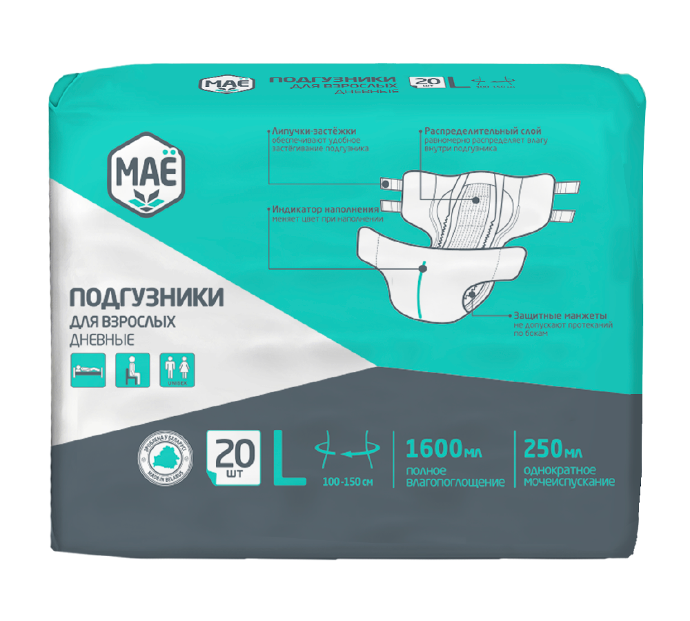 Подгузники для взрослых МАЁ предназначены для людей со средней степенью недержания. Время использования подгузника до 3 часов. Быстро впитывают и удерживают влагу, поддерживая сухость, чистоту и комфорт. Прилегающий к телу слой сделан из мягкого нетканого материала, который обеспечивает бережный уход за кожей. Паропроницаемый внешний защитный слой снижает риск возникновения опрелостей; впитывающий слой состоит из целлюлозы и суперабсорбента (SAP), быстро поглощает и удерживает влагу, превращая в гель, создавая сухость внутри подгузника; широкие эластичные пояса на талии, cпереди и сзади (каждый в сжатом виде длиной не менее 12 см) создают плотное прилегание, защиту от протекания и устойчивую фиксацию; застежки-липучки с микрокрючками (шириной 2,5 см) можно многократно крепить на подгузнике; высокие антифекальные барьеры с эластичными резинками (по 2 штуки в каждом барьере) обеспечивают максимальную защиту от протекания по бокам подгузника; манжеты для ног с эластичными резинками (по 2 штуки в каждом манжете) обеспечивают плотное прилегание подгузника и дополнительную защиту от протекания; индикатор влагонаполнения, нанесенный по всей длине абсорбирующего слоя.