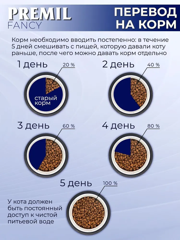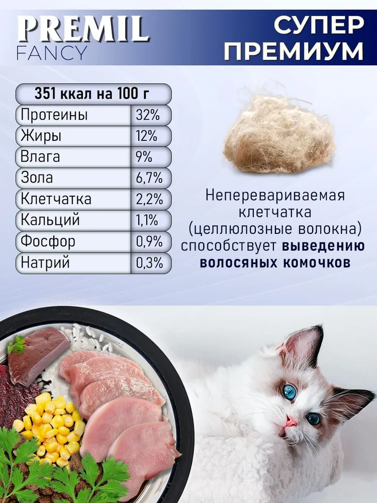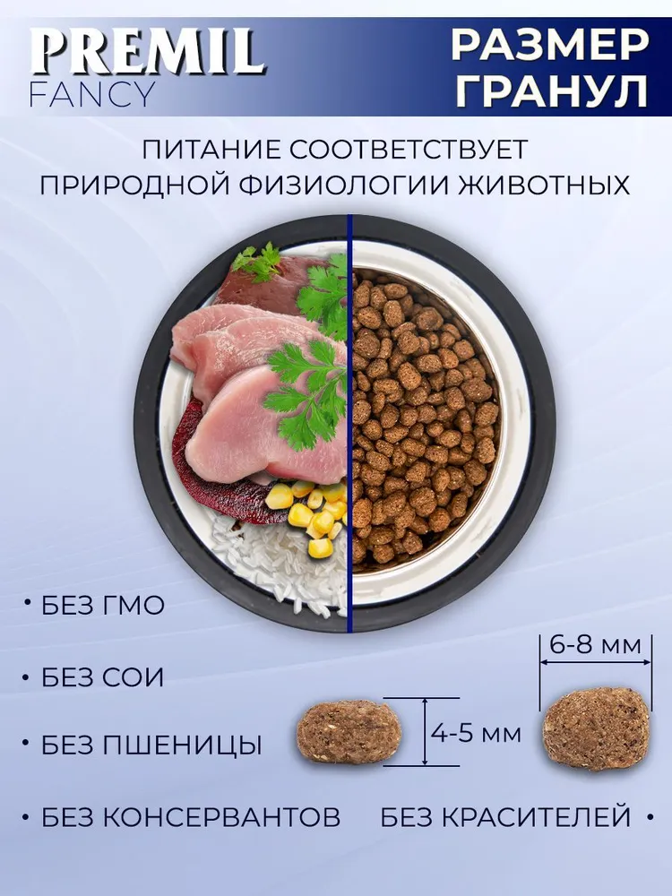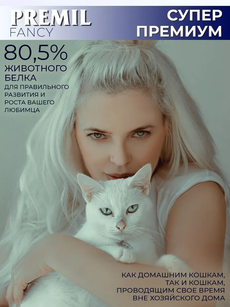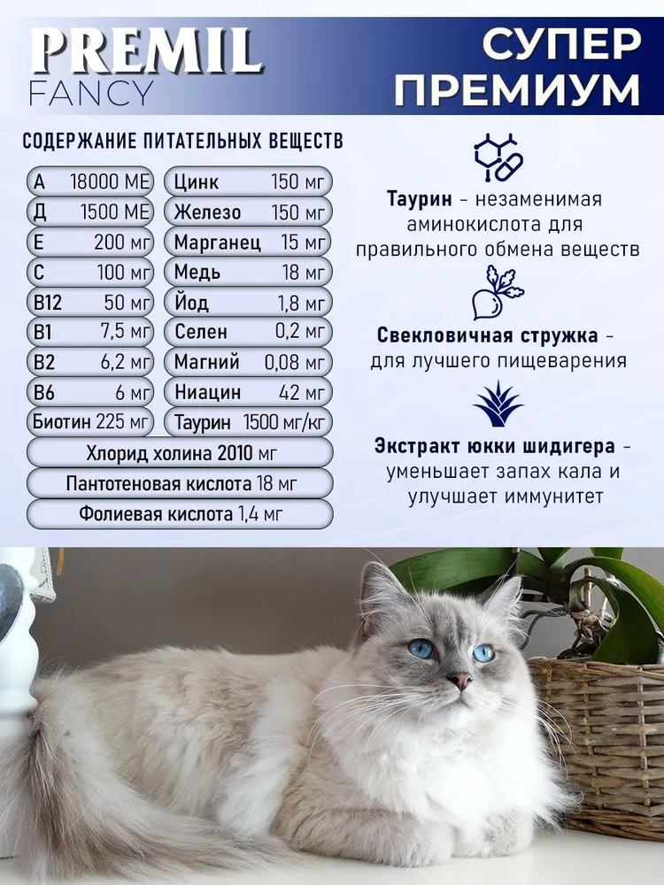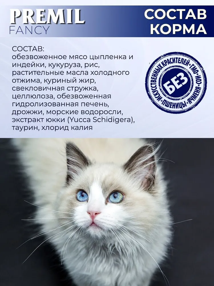 Premil Fancy — это сбалансированный сухой корм для кошек, созданный для ежедневного питания и поддержания здоровья питомца. Рацион разработан с учётом потребностей взрослых кошек, обеспечивает организм необходимыми белками, жирами, витаминами и минералами.