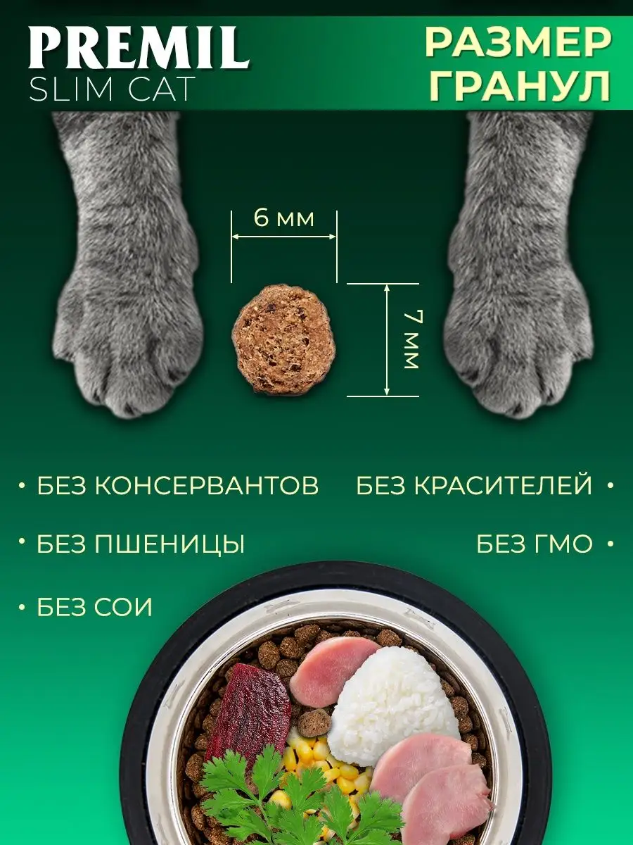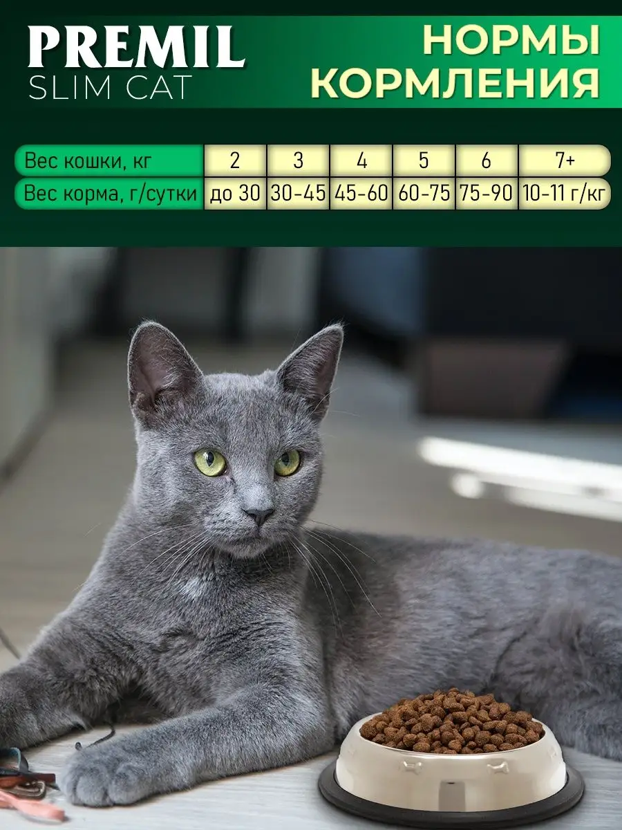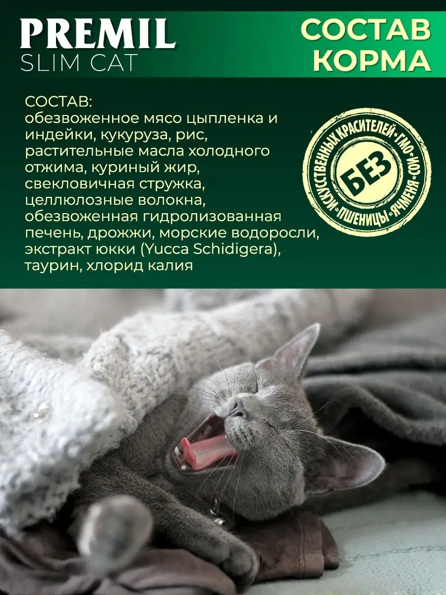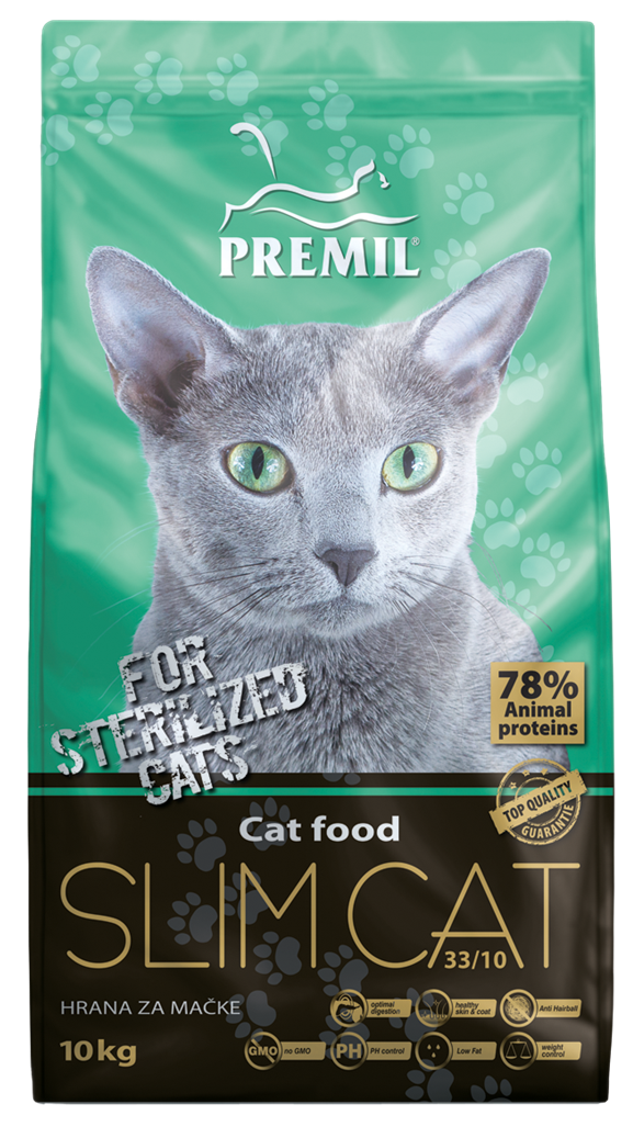 Premil Slim Cat — специализированный низкокалорийный сухой корм для взрослых кошек, склонных к избыточному весу или находящихся на контроле массы тела.