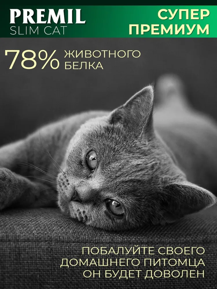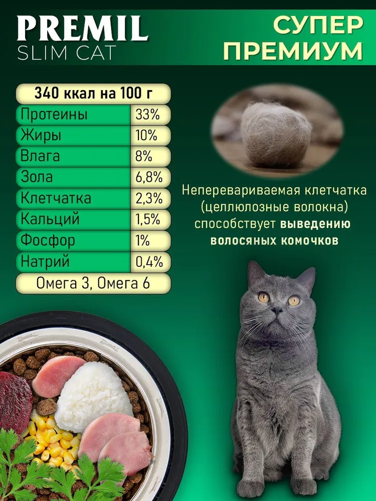 Premil Slim Cat — специализированный низкокалорийный сухой корм для взрослых кошек, склонных к избыточному весу или находящихся на контроле массы тела.