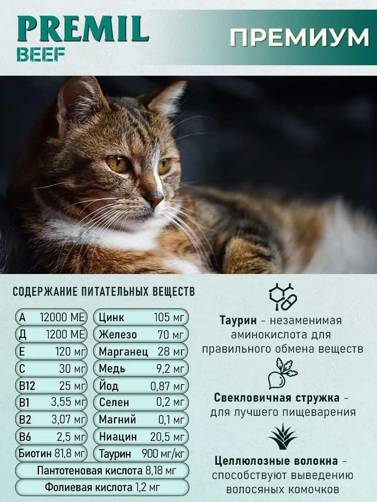 Premil Standard Говядина — полнорационный сухой корм премиум‑класса для взрослых кошек.