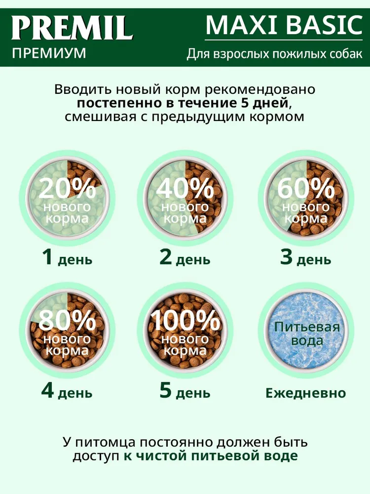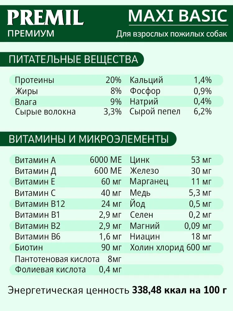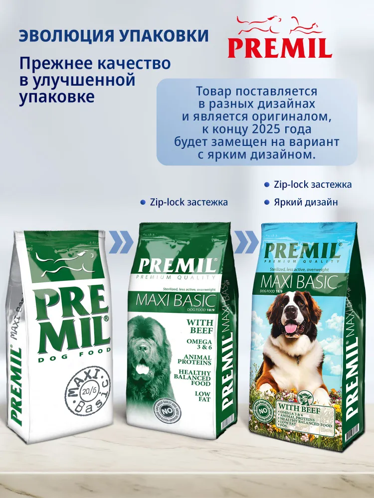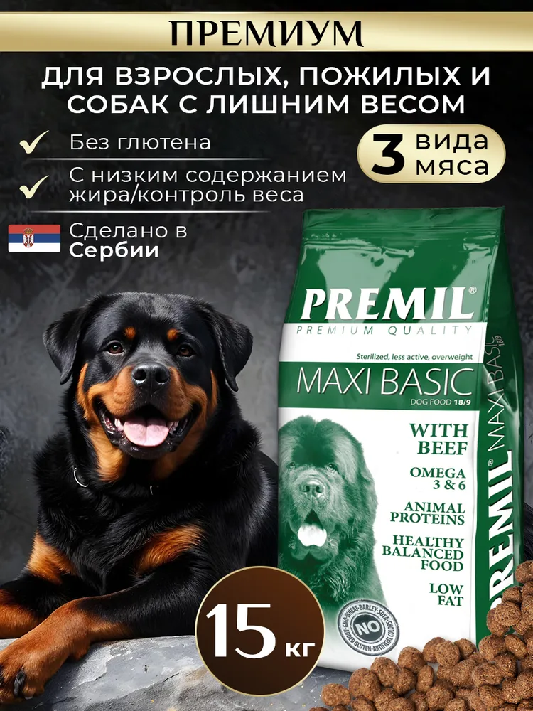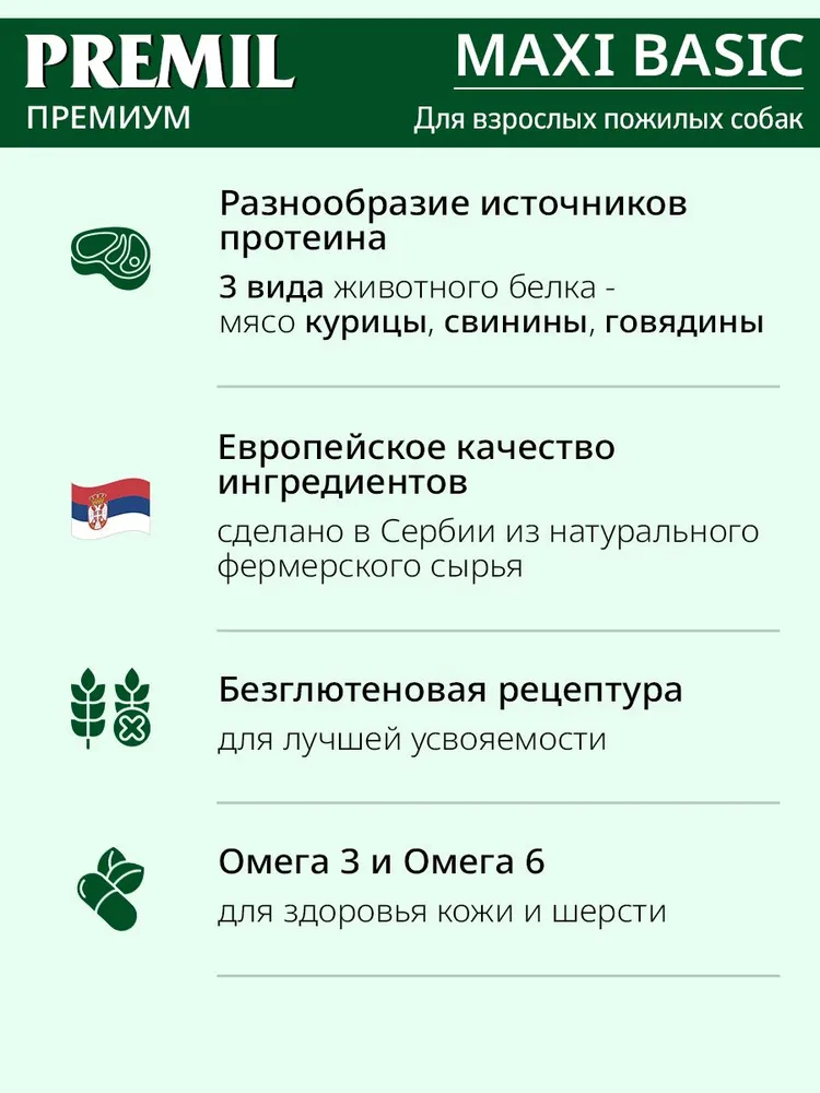 Premil Maxi Basic — полнорационный сухой корм базового уровня для взрослых собак крупных и гигантских пород (от 26 кг и более).