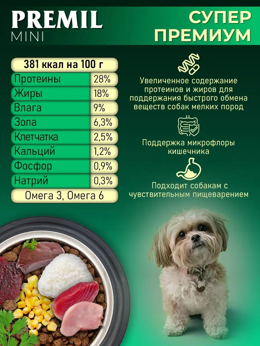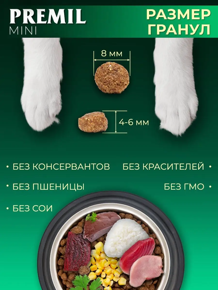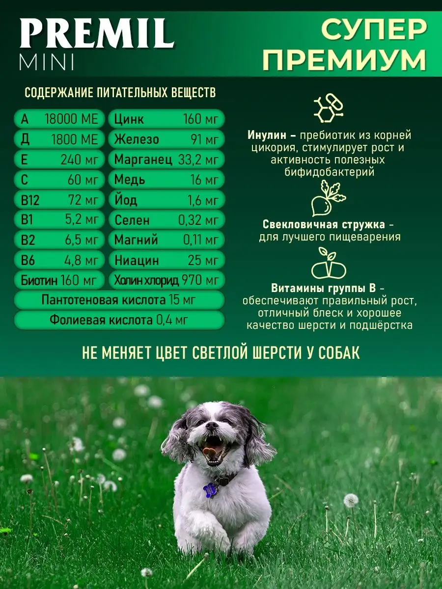 Premil Mini — полнорационный сухой корм премиум‑класса для взрослых собак мелких пород (весом до 10 кг).