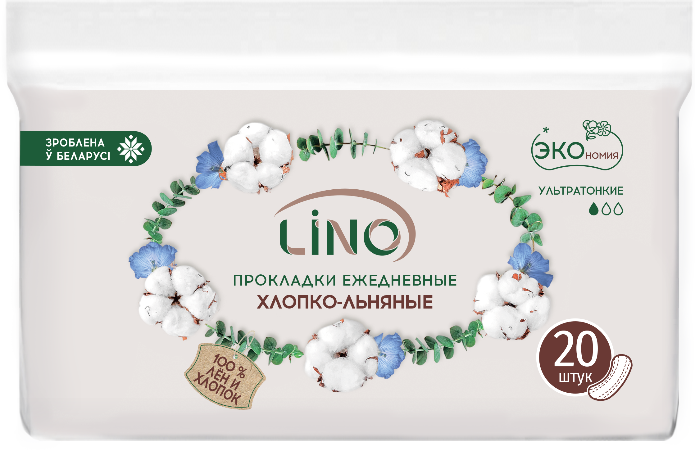 Гигиенические ежедневные прокладки LINO из хлопко‑льняного материала — ультратонкое средство женской гигиены для ежедневного комфорта. В упаковке 20 штук. Толщина прокладки — 0,7 мм: они незаметны под одеждой, не сковывают движений и обеспечивают ощущение свежести в течение дня. Предназначены для ежедневного использования: эффективно впитывают естественные выделения, защищают бельё и поддерживают оптимальный микроклимат. В составе — не менее 30 % льна; изделия отбелены кислородным методом (без хлора). Не содержат отдушек, красителей и синтетических суперабсорбентов, гипоаллергенны и безопасны для чувствительной кожи.