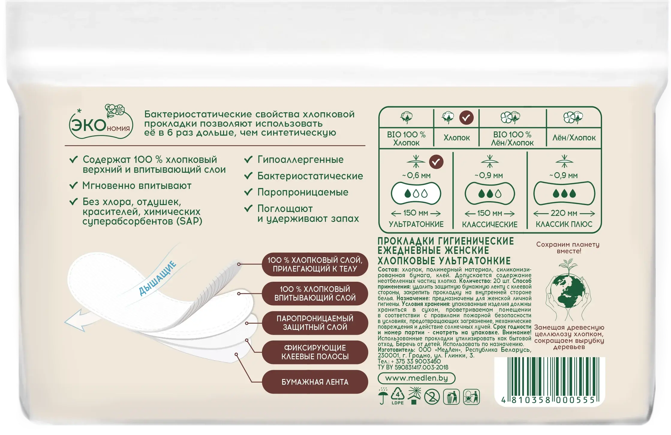 20 шт. в упаковке, 100 % хлопок в составе, ультратонкая конструкция (0,6 мм), незаметны под одеждой, мгновенное впитывание влаги, удержание запаха, гипоаллергенность, отсутствие хлора, отдушек и красителей, бактериостатические свойства (сдерживают размножение микроорганизмов), воздухопроницаемость (предотвращает «парниковый эффект»), нейтральная pH‑среда (не нарушает баланс кожи), не комкаются благодаря переплетённым волокнам, анатомическая форма для идеальной посадки, паропроницаемый нижний слой (защищает от протекания), экологичность (без древесной целлюлозы), подходят для ежедневного использования.