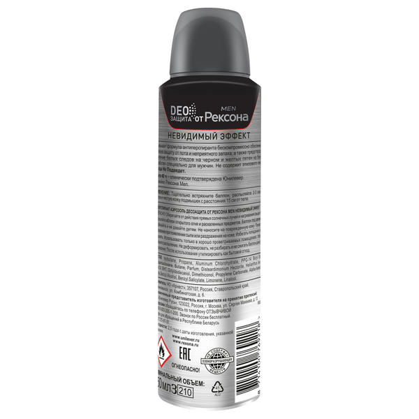 Антиперспирант‑аэрозоль REXONA MEN «Деозащита. Невидимый эффект» обеспечивает надёжную защиту от пота и неприятного запаха, сохраняя одежду безупречно чистой. Специальная формула предотвращает появление белых и тёлтых следов на ткани, подходит для всех цветов одежды. Удобный формат аэрозоля гарантирует равномерное нанесение и быстрое высыхание. Продукт разработан с учётом потребностей мужской кожи и обеспечивает длительную свежесть в течение дня.