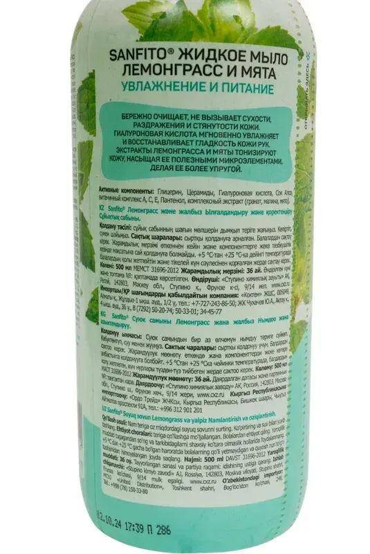 Вода (Aqua), лауретсульфат натрия (Sodium Laureth Sulfate), кокамидопропилбетаин (Cocamidopropyl Betaine), глицерин (Glycerin), хлорид натрия (Sodium Chloride), пантенол (Panthenol), экстракт лемонграсса (Cymbopogon Citratus Extract), экстракт мяты (Mentha Piperita Extract), лимонная кислота (Citric Acid), динатриевая соль ЭДТА (Disodium EDTA), гидрогенизированное касторовое масло PEG‑40 (PEG‑40 Hydrogenated Castor Oil), бензизотиазолинон (Benzisothiazolinone), метилизотиазолинон (Methylisothiazolinone), парфюмерная композиция (Parfum), линалоол (Linalool), лимонен (Limonene).