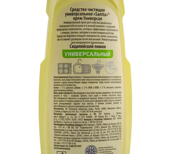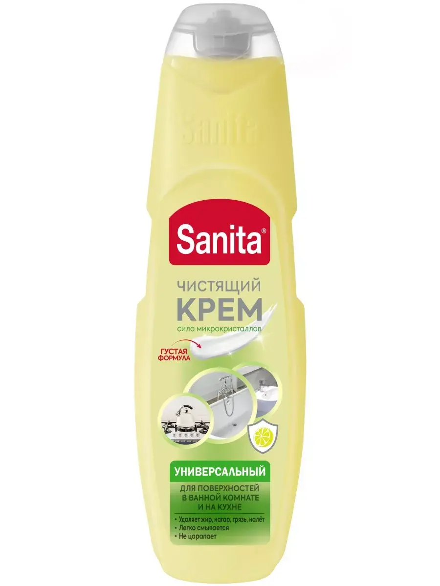 Кремовое универсальное средство для очистки кухонных поверхностей и ванной комнаты Sanita крем Универсал с ароматом "Сицилийского лимона". Эффективно удаляет жир, грязь, известковый налет, ржавчину, не царапает и не повреждает поверхности. Легко смывается, не оставляя разводов даже на тёмных поверхностях. Может применяться для ежедневной уборки плиты, кафеля, металлических и хромированных поверхностей, нержавейки, фаянса, керамической плитки, кранов, посуды, рабочих поверхностей.