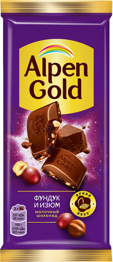 Молочный шоколад Alpen Gold с фундуком и изюмом — гармоничное сочетание нежной шоколадной основы, хрустящих кусочков обжаренного фундука и сладкого изюма.