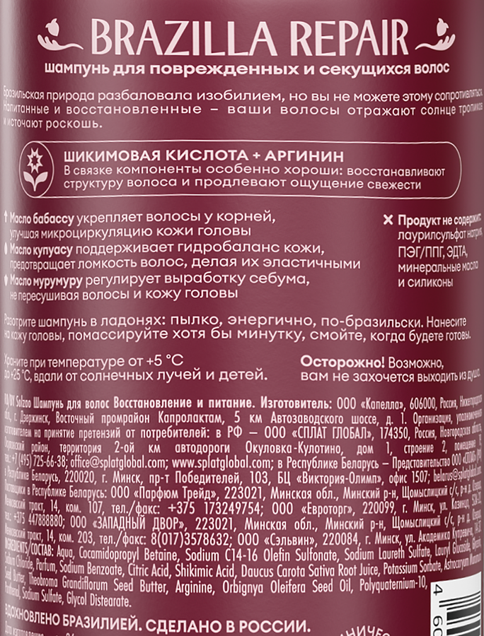 Состав: Вода, кокоглюкозид (растительный ПАВ), кокамидопропилбетаин (мягкий ПАВ), глицерин, экстракт бамбука, масло арганы, пантенол (витамин B₅), гидролизованный кератин, бетаин, лимонная кислота, натуральный консервант (бензоат натрия, сорбат калия), эфирные масла (лаванда, розмарин).