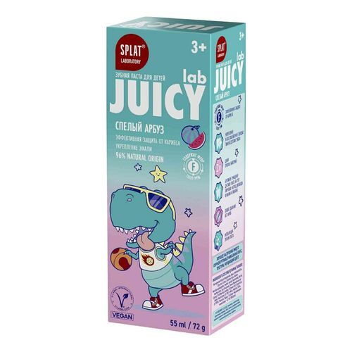 Детская зубная паста SPLAT «Джуси» со вкусом арбуза разработана специально для бережного ухода за молочными и постоянными зубами детей от 3 лет. Мягкая формула без фтора и агрессивных ПАВ эффективно очищает налёт, укрепляет эмаль и защищает дёсны. Яркий фруктовый вкус превращает чистку зубов в увлекательное занятие.