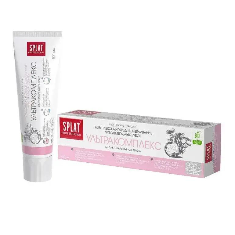 Комплексная зубная паста SPLAT «Ультракомплекс» обеспечивает многофакторную защиту полости рта. Формула с биоактивными компонентами и на уральными экстрактами эффективно борется с налётом, укрепляет эмаль, снижает чувствительность зубов и поддерживает здоровье дёсен.