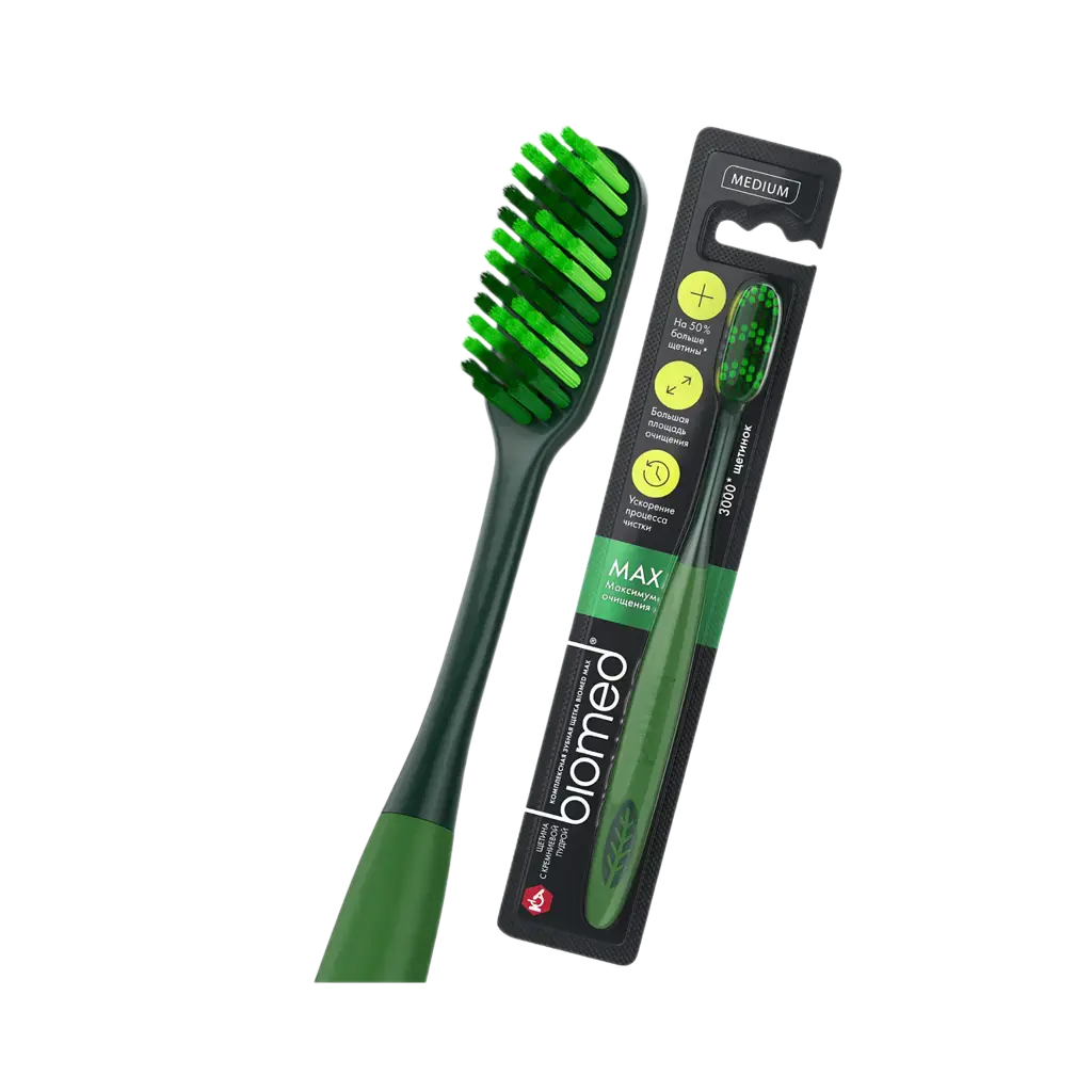 Зубная щётка Biomed средней жёсткости обеспечивает баланс между эффективным очищением и бережным уходом за полостью рта. Специальная форма головки и